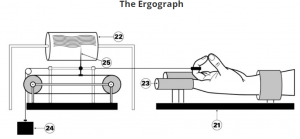 C His device was named an ergograph, meaning “work recorder”. To modern eyes it seems remarkably simple, but such is true of many inventions when viewed with hindsight. It allowed the measurement of the work done by a finger as it was repetitively curled up and straightened. There were basically two parts. One held the hand in position, palm up, by strapping down the arm to a wooden base; this was important to prevent any unintentional movement of the hand while the experiment was taking place. The other part was a recording device that drew the movements of the finger vertically on a paper cylinder which revolved by tiny increments as the experiment proceeded. The index and ring fingers of the hand were each inserted into a brass tube to hold them still. The middle finger was encircled with a leather ring tied to a wire which was connected to a weight after passing through a pulley. The finger had to raise and lower the weight, with the length and speed of these flexions recorded on the paper by a stylus. In this way, he not only learned the fatigue profiles of his subjects but could observe a relationship between performance, tiredness and the emotional state of his subjects.